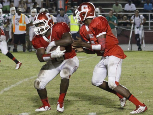 Emmanuel Reed takes a handoff from Khalil Foster against Choctaw on Sept. 6. Reed has been a threat running and catching the ball for the Bulldogs as they travel to Navarre on Friday.