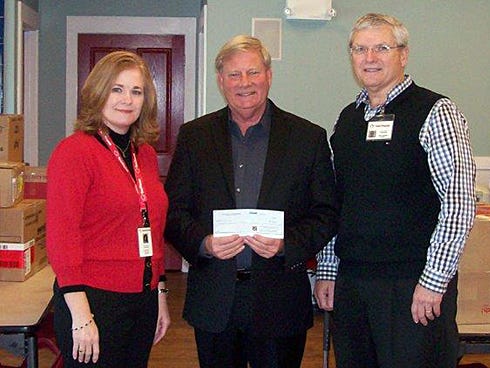 Teresa Smith, Tom Thumb Inc. vice president of operations, left, and Mark Salisbury, Tom Thumb Inc. president, right, presents a $750 donation and several boxes of gifts to Ken Hair, CIC president and CEO. The funds will be used to help feed, clothe and care for children living at the CIC Neighborhood; the gifts are for the CIC Educational Incentive program.